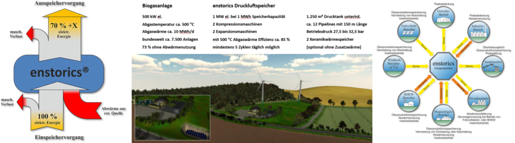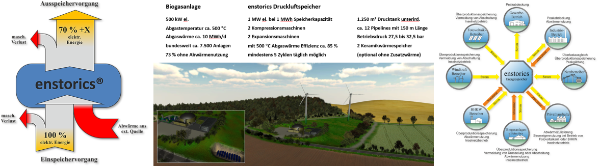 Die Beispielgrafik in der Mitte zeigt die Umsetzung dieses Druckluftspeichers zur Speicherung von Windstrom und gleichzeitiger Nutzung der Abgas-Abwärme einer Biogasanlage. Der erreichte Strom zu Strom Wirkungsgrad liegt dabei bei rund 85%.
